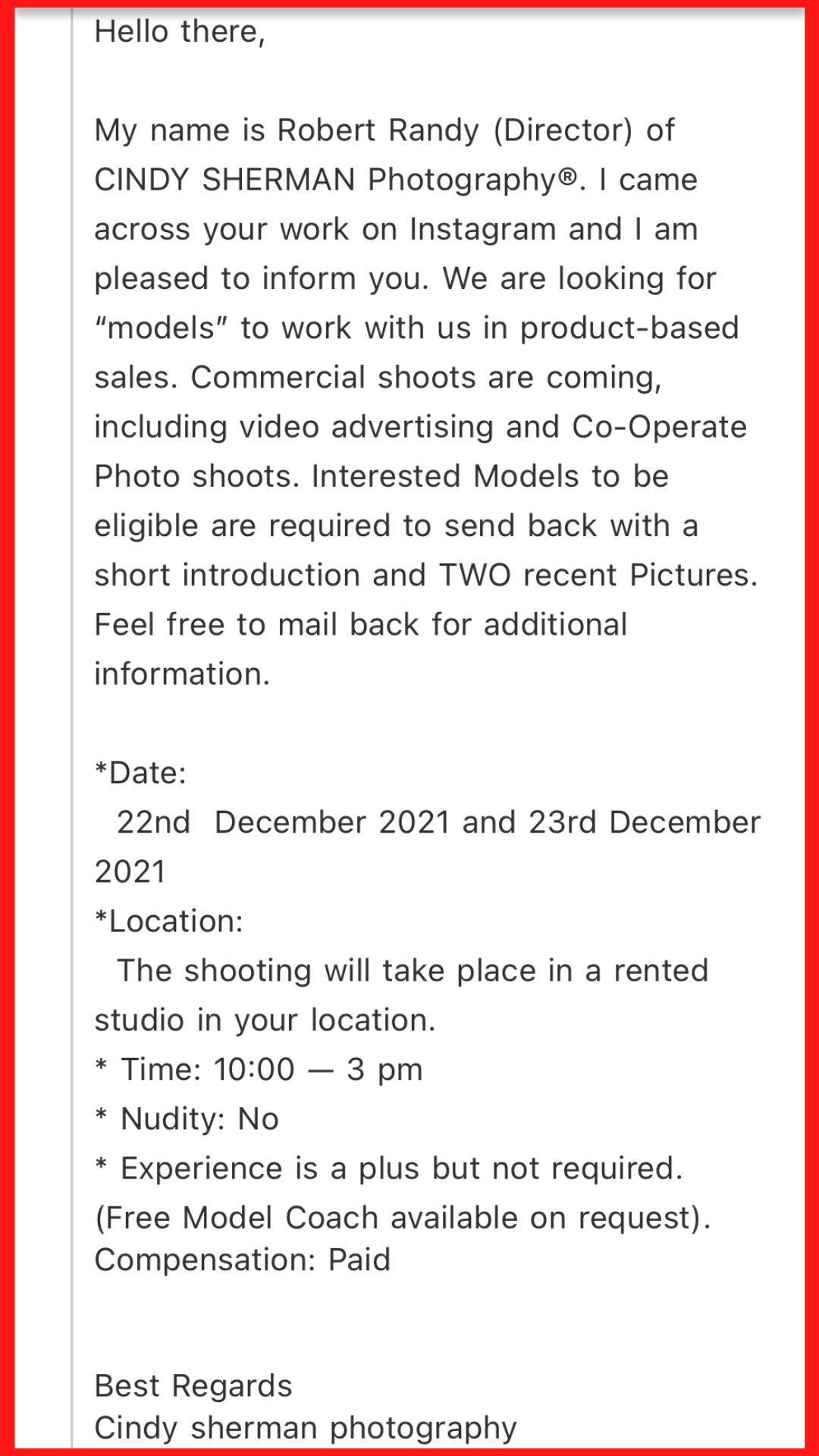Frequently, these scammers offer enticing perks such as a complimentary model coach, assert that their studio operates locally, and occasionally dangle overly generous compensation figures. They might be vague, offering scant information about the actual shoot, or conversely, inundate you with excessive details. However, their common tactic is to request payment upfront before embarking on your modeling journey. Be advised, all these are telltale signs of scams.